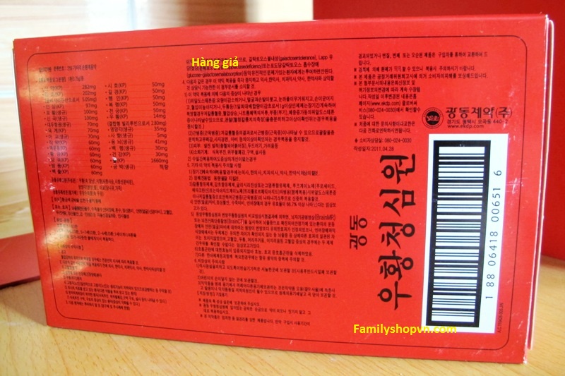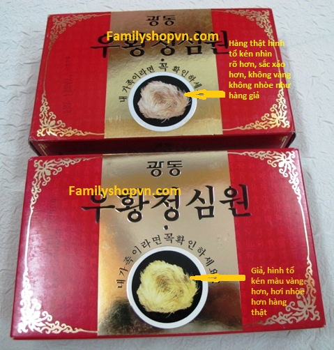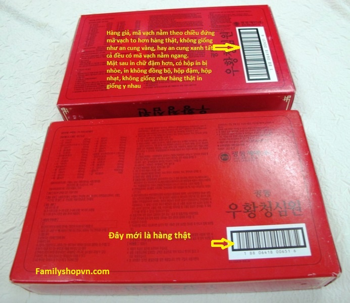 Hiện nay trên thị trường có an cung ngưu hoàn đỏ tổ kén giả, quý khách để ý kỹ sẽ phát hiện, cách dễ nhất là cầm 3 hộp an cung ngưu hoàn đỏ, vàng, xanh xem mã vạch ở mặt sau sẽ phát hiện ra mã vạch của an cung đỏ tổ kén giả khác 2 loại còn lại, chữ in trên hộp hơi đậm hơn, có hộp bị nhòe, in không đồng đều, hộp in đậm, hộp in nhạt. Đã có khách hàng uống và phát hiện báo cho tôi biết, chỉ uống 1 viên hàng giả là phát hiện ra ngay. Quý khách cẩn thận, đừng vì rẻ hơn chút ít mà ảnh hưởng đến sức khỏe của mình, tiền mất tật mang.