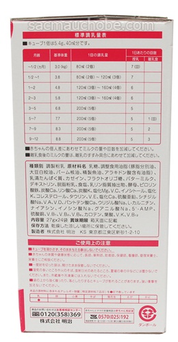 Thành phần:  đường, điều chỉnh các loại dầu ăn và chất béo ( đậu tương trắng Shiboabura, dầu hạt cọ, dầu cá tinh chế, dầu acid có chứa arachidonic), protein whey, casein, fructo-oligosaccharide, sữa bơ, dextrin, kem sữa, muối , sữa phospholipid chiết xuất, nấm men, sắt pyrophosphate, cacbonat Ca, axit photphoric Ca, cacbonat K, Mg clorua, VC, inositol, clorua K, cholesterol, taurine, VE, clorua Ca, kẽm sulfat, cytidylate Na, VA , VD, pantothenic axit Ca, Na uridylate, carnitine L, niacin, acid inosine Na, guanylate Na, 5'-AMP, đồng sunfat, V.B1, V.B2, V.B6, carotene, acid folic, VK , V.B12