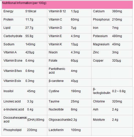 -    Cung cấp đầy đủ: năng lượng, chất đạm, chất béo, chất bột đường, các Vitamin và khoáng chất cần thiết cho cơ thể theo tỷ lệ cân bằng. Ngoài ra, trong sữa còn bổ sung thêm các chất cần thiết cho sự phát triển trí não như acid linoleic, acid linolenic, DHA; những chất cần thiết cho hệ miễn dịch của cơ thể như Oligosacharid giúp tăng cường tiêu hóa