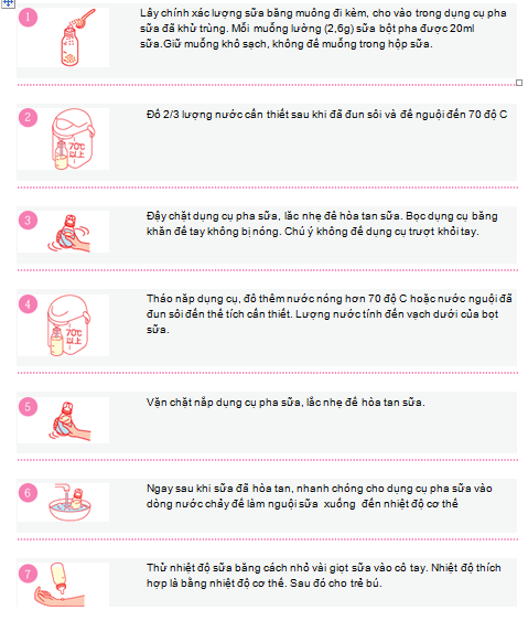 Chú ý: Không pha thực phẩm công thức bằng nước sôi. Không đun sôi thực phẩm công thức đã pha. Không làm nóng bằng lò vi sóng. Chỉ pha vừa đủ cho mỗi lần dùng, phần còn lại sau 2 giờ nên bỏ đi.